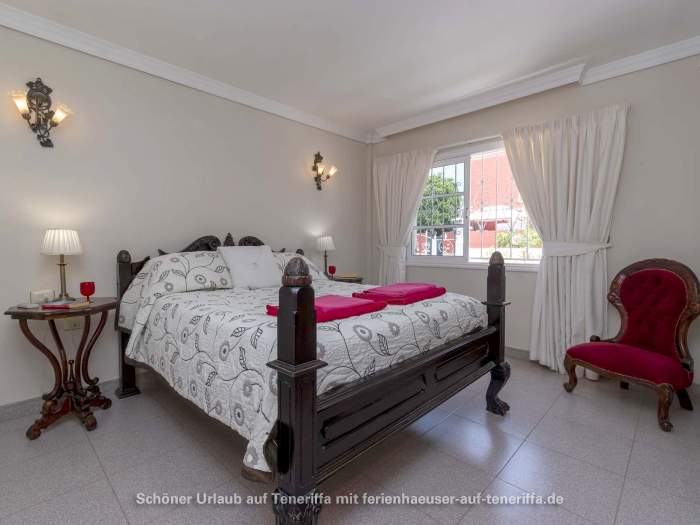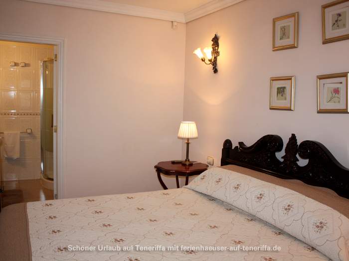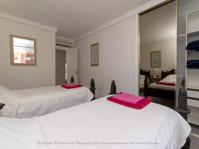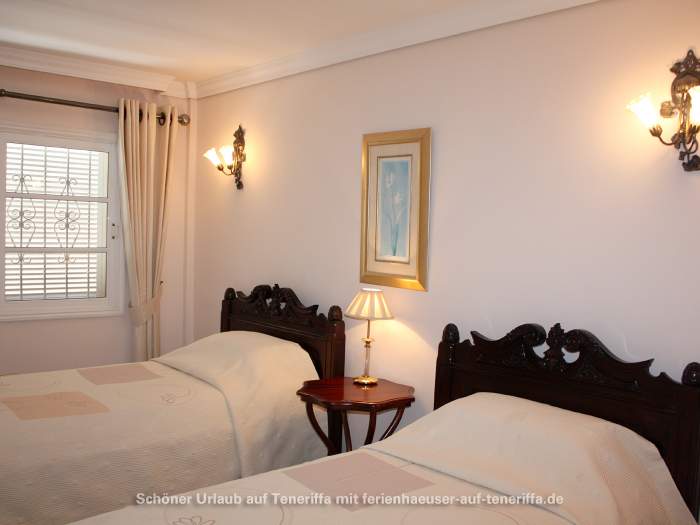Zur Villa gehören drei Schlafzimmer: Zwei Schlafzimmer sind mit Doppelbetten und Bad en Suite (Dusche, WC, Waschtisch, Bidet) ausgestattet, das dritte Schlafzimmer mit zwei Einzelbetten. Zusätzlich gibt es ein weiteres Badezimmer mit Badewanne, Waschbecken, Bidet und WC. Sowohl im Wohnzimmer als auch in allen drei Schlafzimmern ist eine Klimaanlage installiert, um an heißen Tagen angenehme Temperaturen zu gewährleisten.