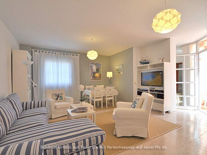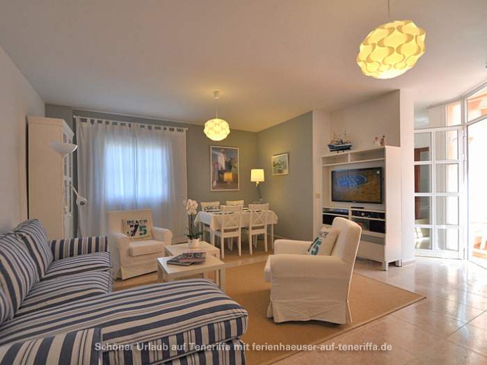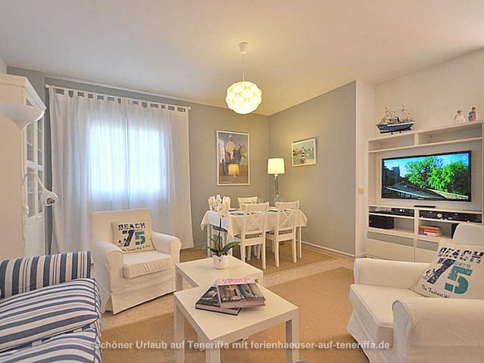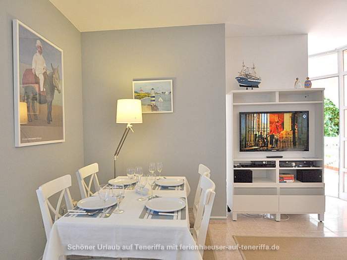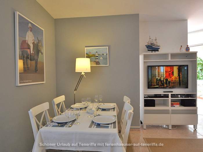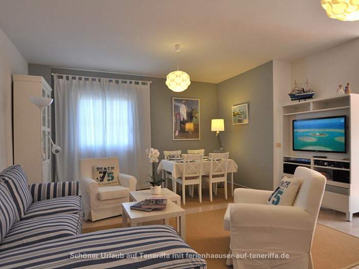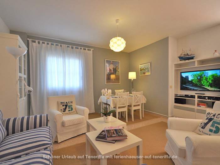 Die stilvoll eingerichtete Wohnung besticht durch eine maritime Atmosphäre und ist hervorragend ausgestattet. Über zwei Treppenstufen gelangt man ins offene Wohn- und Esszimmer, das hell und komfortabel gestaltet ist. Angrenzend befindet sich die moderne Küche, die mit Saftpresse, Mikrowelle und weiteren nützlichen Geräten ausgestattet ist. Die Einrichtung der gesamten Wohnung ist in hellen, freundlichen Tönen gehalten, was eine angenehme Wohlfühlatmosphäre schafft. Im Wohnbereich sorgen ein Flatscreen-TV mit Sat-TV, DVD-Player, Filme, Brettspiele und eine Auswahl an Büchern für Unterhaltung. An den Wänden hängen selbst gemalte Bilder des Eigentümers sowie beeindruckende Drucke europäischer Museen.