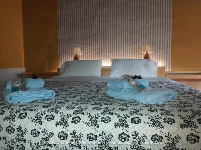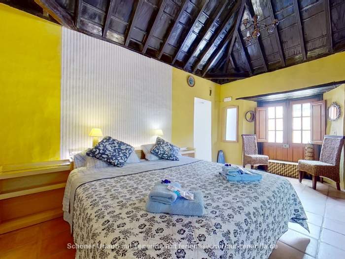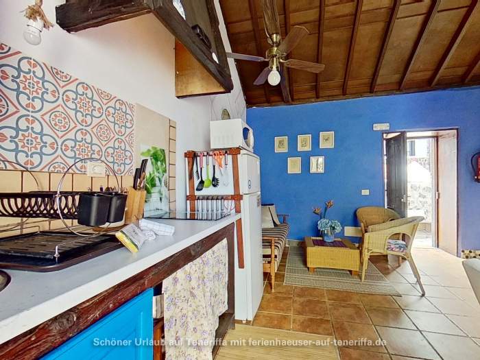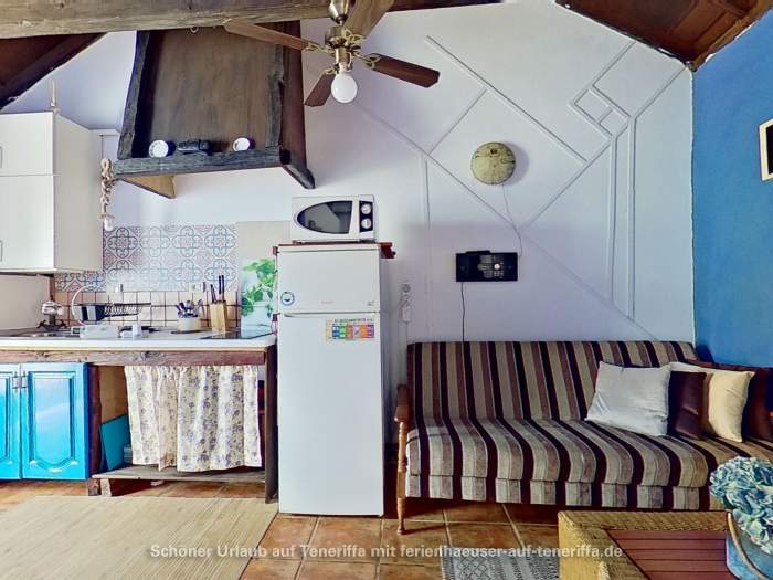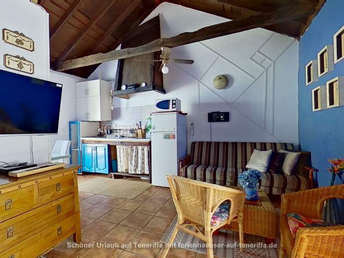 Das Apartment ist ideal für bis zu zwei Personen ausgestattet und im rustikalen, typisch kanarischen Stil gestaltet. Es verfügt über ein gemütliches Schlafzimmer mit Doppelbett und Kleiderschrank, ein Wohnzimmer mit offener Küche sowie ein modernes Badezimmer. Die Küche ist vollständig ausgestattet, inklusive zwei Kochplatten, Toaster, Mikrowelle, Kaffeemaschine und weiteren Küchenutensilien. Das Badezimmer beeindruckt mit einer Dusche mit Hydromassagefunktion, Waschbecken, WC, Fön und Bademänteln.