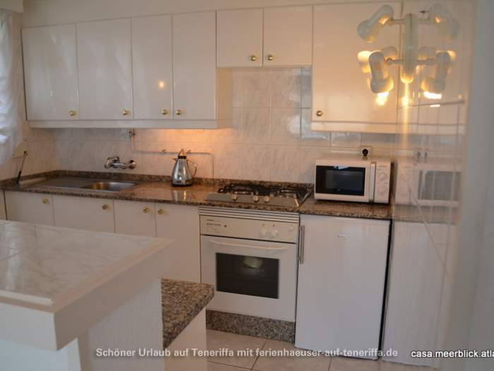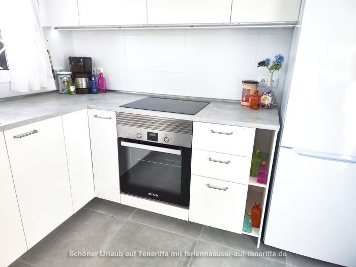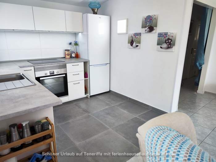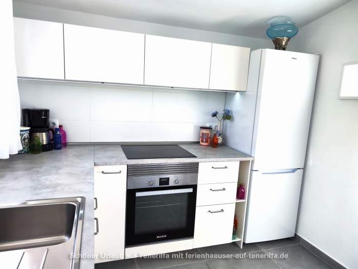 Das lichtdurchflutete Wohnzimmer besticht durch große Fensterfronten, die viel Tageslicht hereinlassen. Es ist mit zwei komfortablen Sofas, zwei kleinen Tischen sowie einem großen Flatscreen SAT-TV ausgestattet, perfekt für entspannte Abende. Die modern eingerichtete Küche verfügt über einen Ceran-Herd, einen Kühlschrank mit kleinem Gefrierfach, Backofen, Mikrowelle, Toaster, Senseo-Kaffeemaschine, Wasserkocher und Pürierstab, sodass Sie bequem selbst kochen können.
