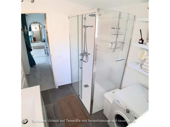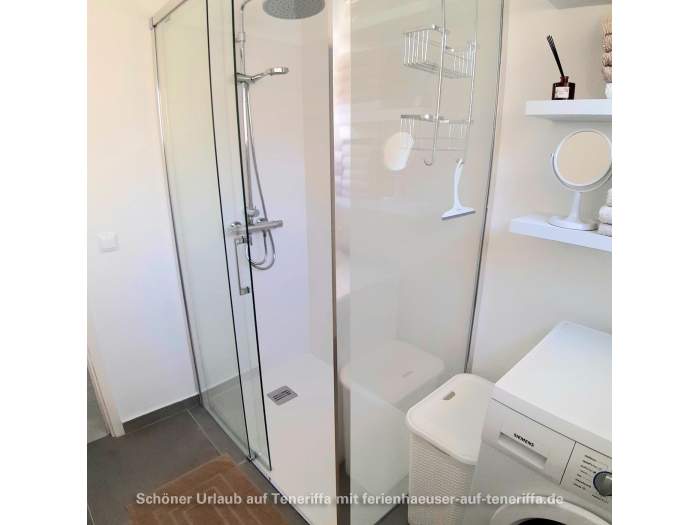 Das Schlafzimmer ist mit einem großen Doppelbett (2 m x 2 m), einem geräumigen Kleiderschrank und einem Safe ausgestattet, um Ihre Wertsachen sicher zu verwahren. Das Badezimmer beeindruckt durch eine große Fensterfront und eine Dusche. Zusätzlich gibt es ein separates WC mit Waschbecken, sowie weitere Staumöglichkeiten, Staubsauger, Bügeleisen und eine Waschmaschine für Ihren Komfort.