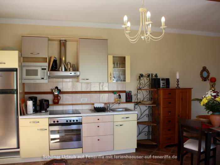 Die offene Küche ist modern und voll ausgestattet mit allen wichtigen Utensilien, darunter ein Backofen, Mikrowelle, 4-Platten-Ceranfeld, Wasserkocher, Kaffeemaschine, Toaster, Eierkocher und Saftpresse, sodass Sie bequem Ihre Mahlzeiten zubereiten können.