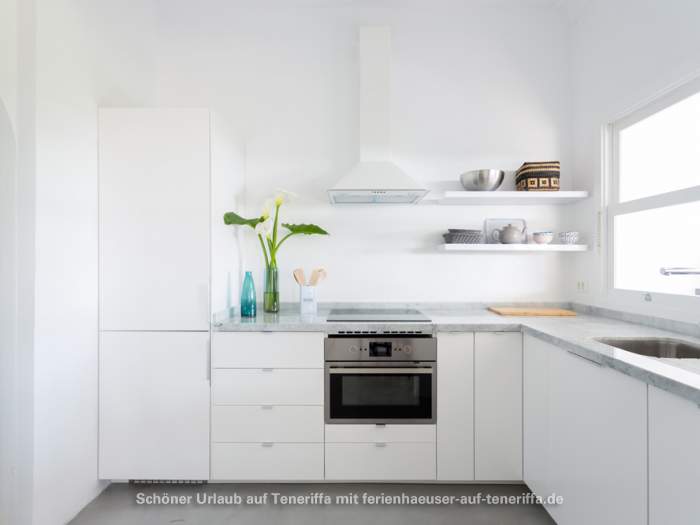 Die Küche ist komplett ausgestattet mit Waschmaschine, Geschirrspüler, Kaffeemaschine, Ofen, Wasserkocher, Toaster und weiteren Küchenutensilien, die den Aufenthalt komfortabel machen.