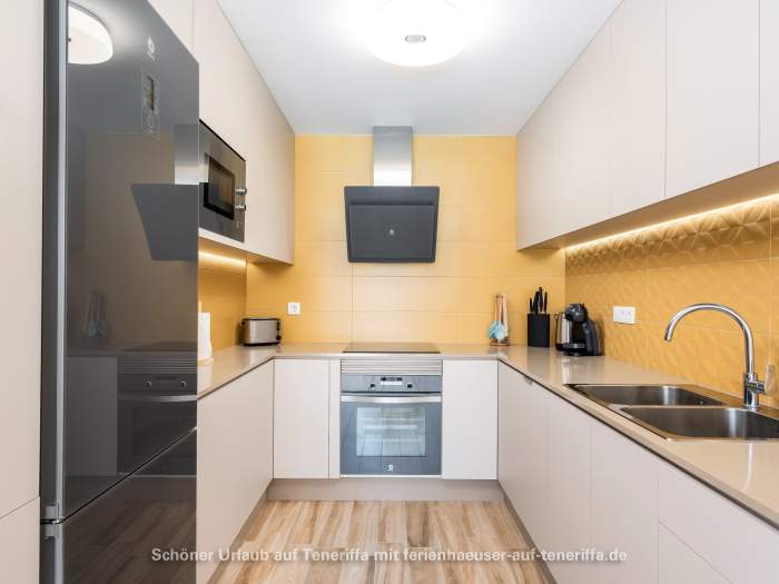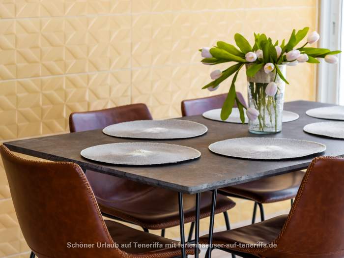 Direkt neben dem Wohnzimmer befinden sich das Esszimmer und die voll ausgestattete Küche. Diese ist modern gestaltet und bietet alle Utensilien für die Zubereitung Ihrer Mahlzeiten: Herd mit Backofen, Kühlschrank mit Gefrierfach, Mikrowelle sowie weitere Küchengeräte. Eine Geschirrspülmaschine sorgt dafür, dass das Spülen nach dem Essen stressfrei von der Hand geht, sodass Sie mehr Zeit für Ihren Urlaub haben.