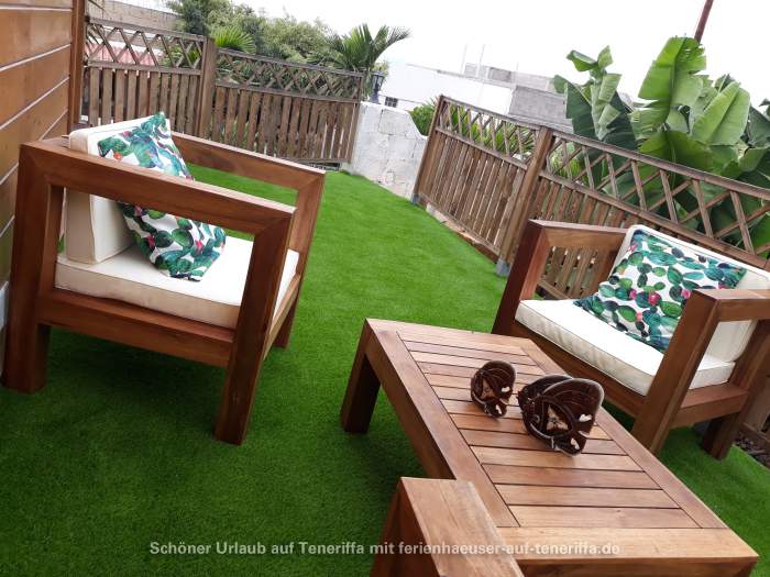 Zum Anwesen gehört ein großzügiger Chilloutgarten, der über eine hohe Treppe erreichbar ist. Hier erwartet Sie eine inspirierende Oase mit einem Tempel oder Pavillon, einem Grillbereich inklusive Kühlschrank, einem überdachten Essbereich sowie einem offenen Air-Garten. Die Umgebung ist geprägt von blühenden Blumen, Ziersträuchern und schattenspendenden Bäumen. Von diesem Garten führt ein Weg (etwa 20 Meter) direkt zum Meer. Unten angekommen, finden Sie Meeresschwimmbäder mit Leitern sowie den Sandstrand von Alcala, ausgestattet mit Sonnenliegen, Sonnenschirmen und einer Strandbar.