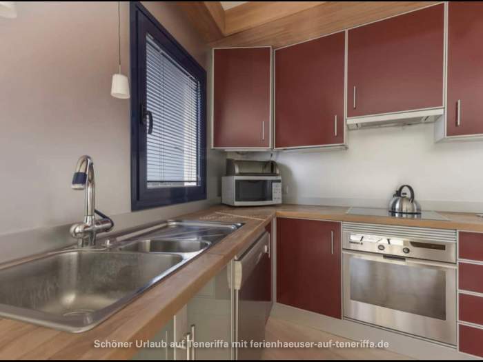 Die Küche ist komplett ausgestattet mit einem Ceranherd mit Backofen, einer Kühl-Gefrierkombi, einem Geschirrspüler, einer Kaffeemaschine, Mikrowelle und weiteren Küchenutensilien. Der Wohnbereich bietet ein bequemes Sofa sowie einen Esstisch für gemeinsame Mahlzeiten. Das Badezimmer ist mit einer Dusche, WC und Waschbecken ausgestattet. Das erste Schlafzimmer verfügt über ein Doppelbett (160 x 200 cm), das zweite über ein Etagenbett, das ideal für zwei Kinder oder einen Erwachsenen ist. Bei Bedarf kann das obere Bett an die Wand geklappt werden, um Platz zu sparen.