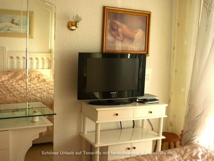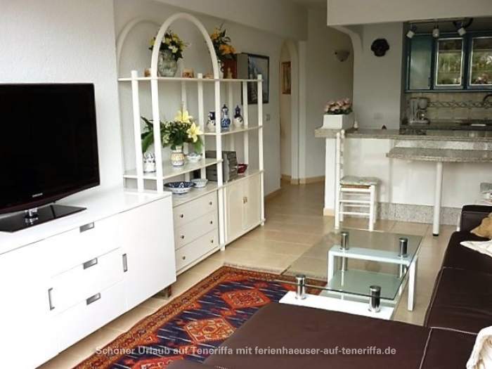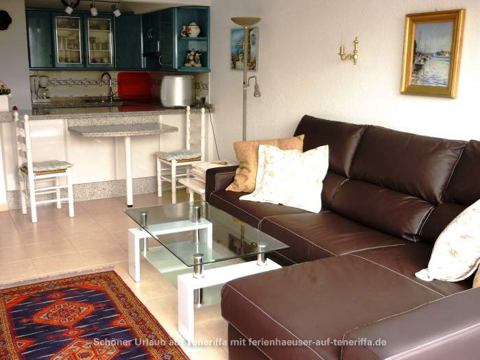 Im Wohnzimmer befindet sich ein weiterer Fernseher, ein bequemes Sofa sowie ein Couchtisch. Deutsche TV-Programme sind vorhanden, ebenso wie WLAN-Internet. An heißen Tagen sorgt ein Deckenventilator für angenehme Luftzirkulation.