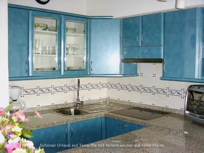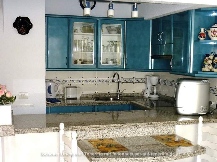 Die offene Küche ist durch einen Tresen mit kleinem Esstisch vom Wohnbereich getrennt. Sie ist vollständig ausgestattet mit einem Herd mit vier Kochfeldern, Mikrowelle, Kühlschrank, Wasserkocher, Kaffeemaschine, Toaster sowie ausreichend Besteck, Geschirr und Kochutensilien, um Mahlzeiten zuzubereiten.