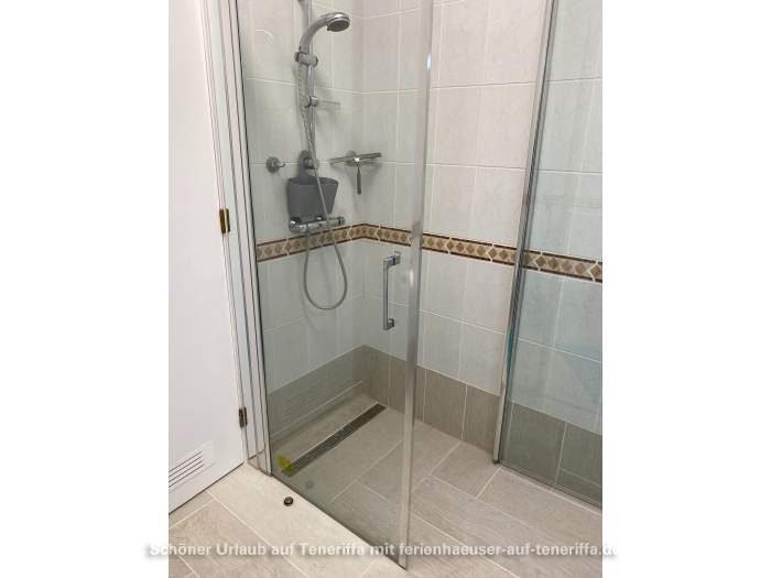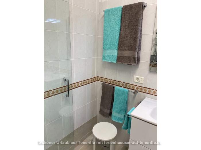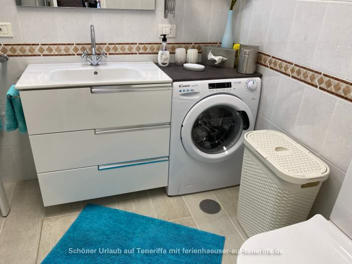 Das Badezimmer ist mit einer begehbaren Dusche und einer Waschmaschine ausgestattet. Es stehen Handtücher, Strandtücher und Bademäntel zur Verfügung.
