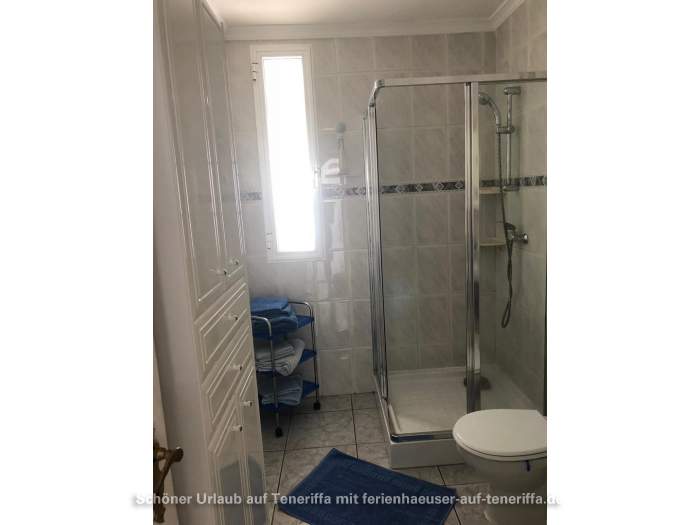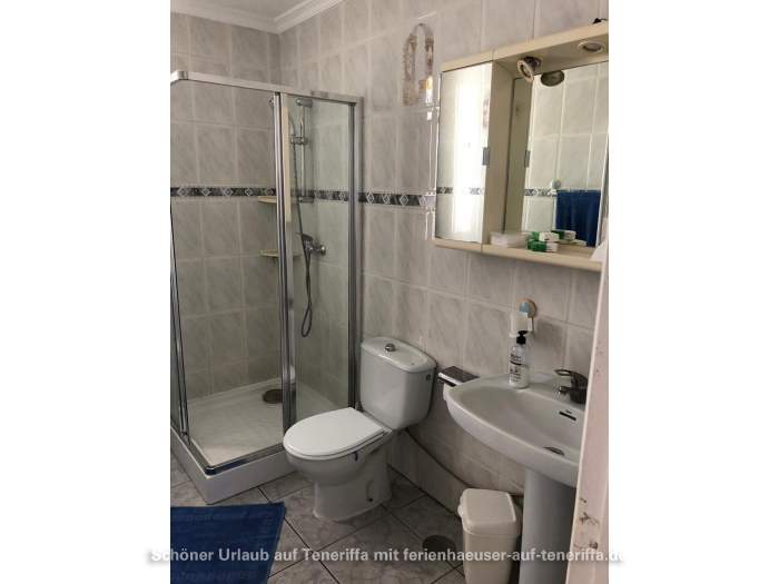 Das Badezimmer ist mit einer Dusche, einem Waschbecken und WC ausgestattet. Die Waschmaschine befindet sich in einem separaten Abstellraum.
