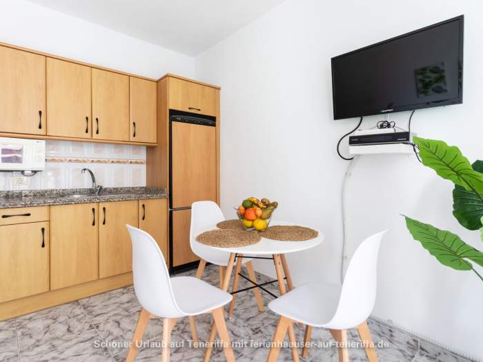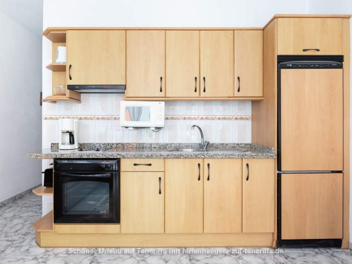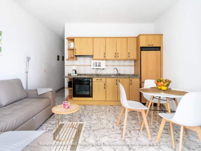 In der Wohnung in typisch kanarischem Stil findet sich ein Schlafzimmer mit zwei Einzelbetten, eine sehr moderne und für Selbstversorger umfassend ausgestattete Einbauküche, ein Duschbad mit Einbaumöbeln und Bidet und ein großer, einladender Wohnraum mit Schlafcouch. Die Schiebefenster lassen nicht nur jede Menge Licht in diesen Raum, sie geben ihm auch den unvergleichlichen Charme eines Wintergartens.