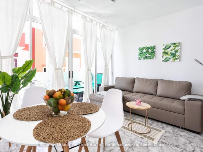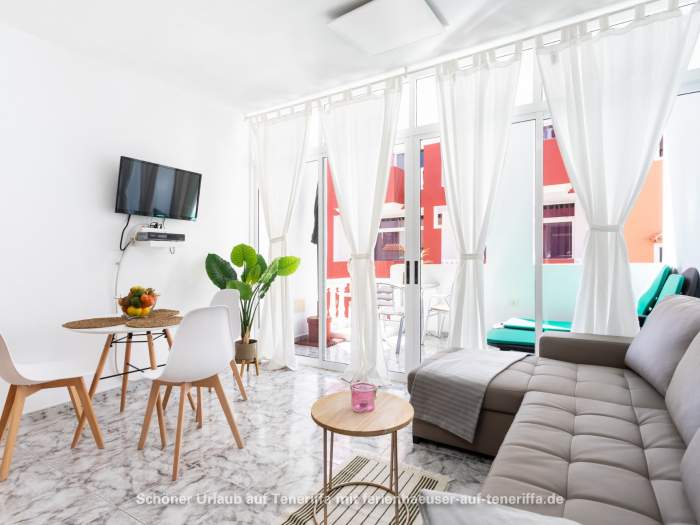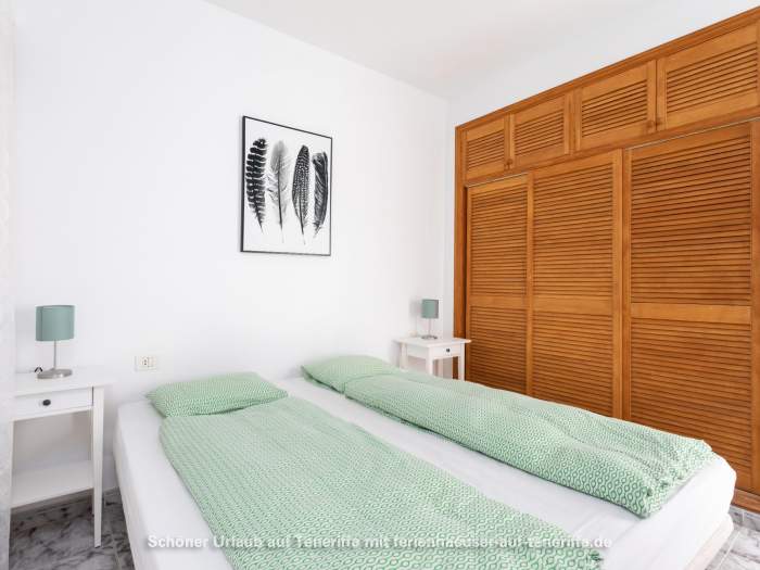 In einer ruhigen Seitenstraße findet sich diese Wohnung im Dachgeschoss eines kanarischen Apartmenthauses. Von hier aus sind es nur wenige Meter bis zur Badebucht. Zur Ferienwohnung gehört eine Gemeinschafts-Dachterrasse mit herrlichem Meerblick und eine zweite Terrasse mit Blick auf die Bucht, verschieden Pflanzen und schönen Liegestühlen und Gartenmöbeln. Hier kann man einfach nu den Charme der Insel und des Ortes genießen.
