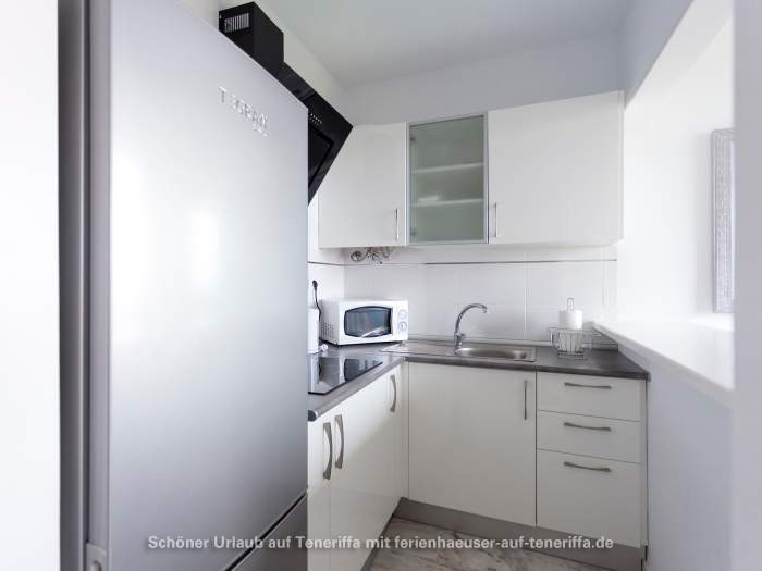 Die Küche ist vollständig ausgestattet mit einem Keramikkochfeld mit vier Platten, Mikrowelle, Kaffeemaschine, Wasserkocher sowie weiteren Küchenutensilien. Der Wohnbereich verfügt über eine gemütliche Essecke und eine Sofaecke mit Fernseher, ideal für entspannte Abende.