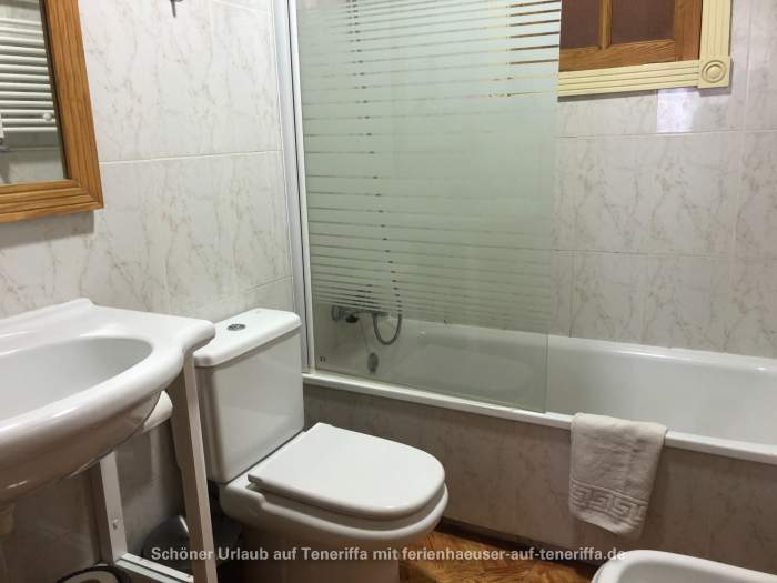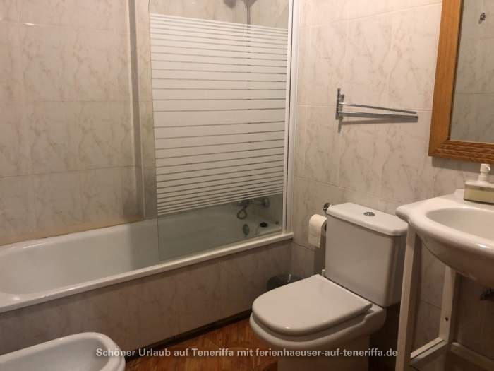 Das Badezimmer besitzt eine Badewanne, ein Waschbecken, WC und Bidet, für Komfort und Erholung.