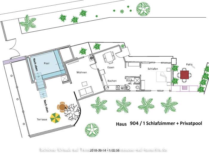 Das Ferienhaus ist komfortabel und modern eingerichtet, ideal für einen ruhigen Rückzugsort. Der offene Küchenbereich ist mit einer Küchenzeile ausgestattet und bietet einen Essplatz, von dem aus Sie den Meerblick genießen können. Der Wohnraum verfügt über ein bequemes Sofa sowie einen Flachbildfernseher mit deutschen Kanälen. Das Badezimmer ist mit Dusche, Waschtisch und WC ausgestattet. Das Schlafzimmer besticht durch helle, frische Farben und moderne Möbel, sodass Sie hier erholsam schlafen können. Der Außenbereich umfasst einen Patio mit Sitzecke, einen privaten Pool sowie einen Grill, perfekt für gesellige Abende im Freien.
