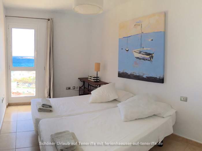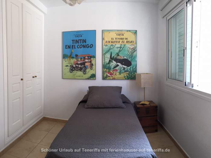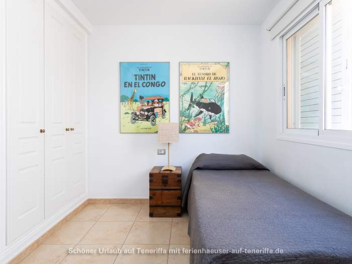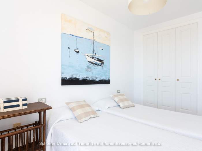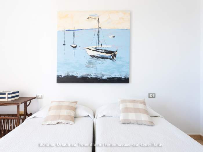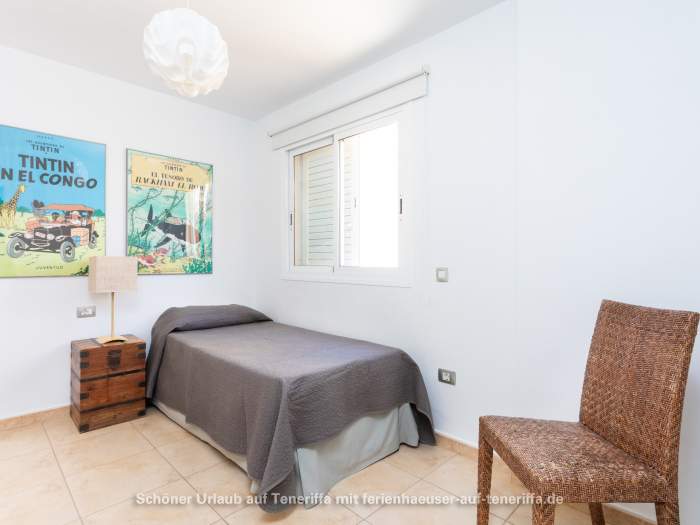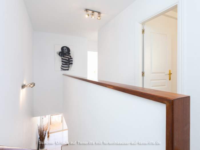 Die obere Etage beherbergt die Schlafzimmer: Eines mit einem Doppelbett und Balkon, das zweite mit zwei Einzelbetten, das dritte mit einem Einzelbett. Außerdem befinden sich auf dieser Ebene die beiden Badezimmer.