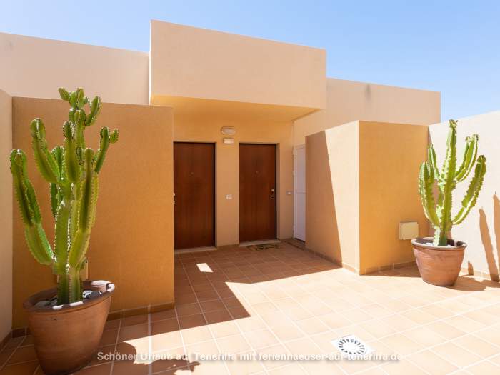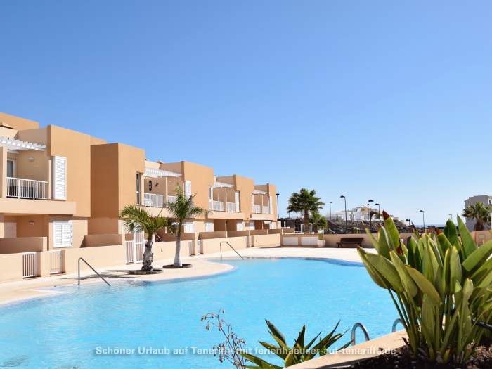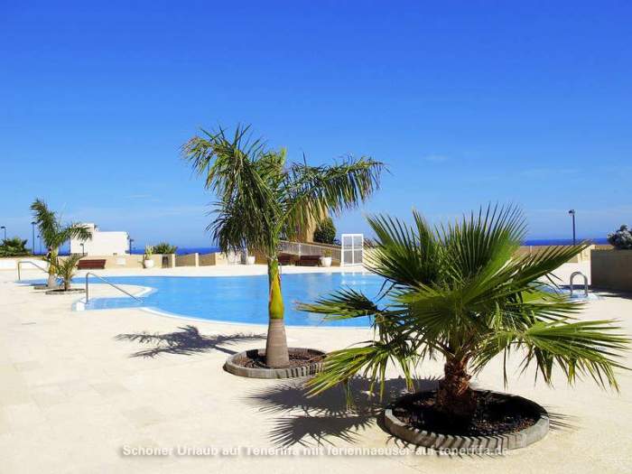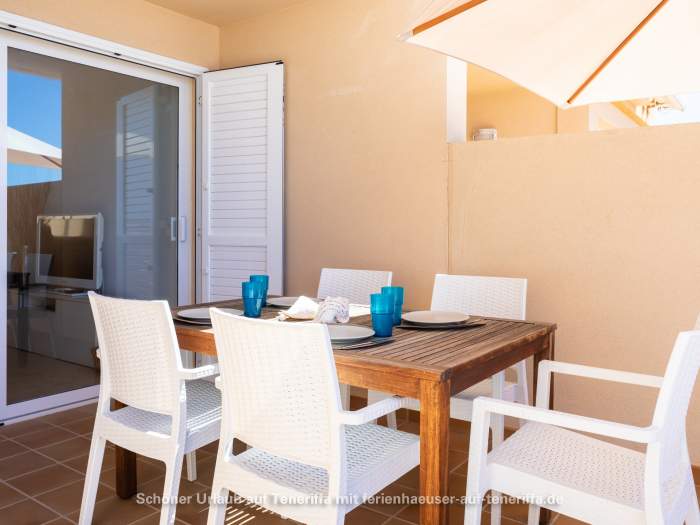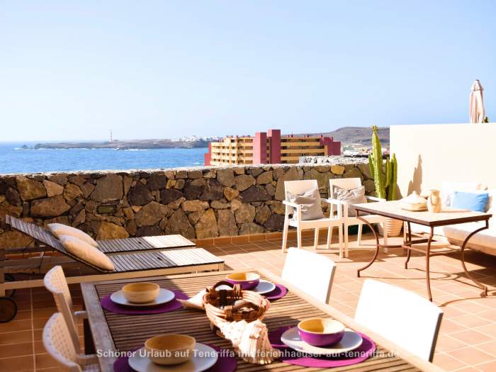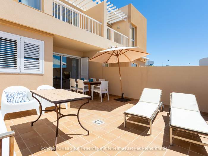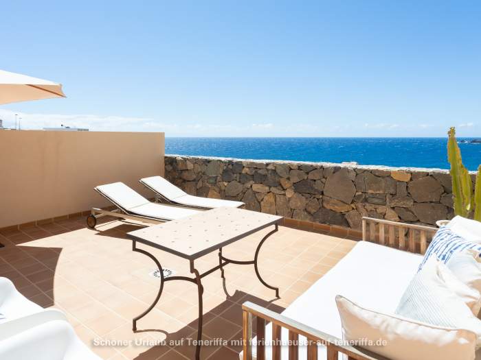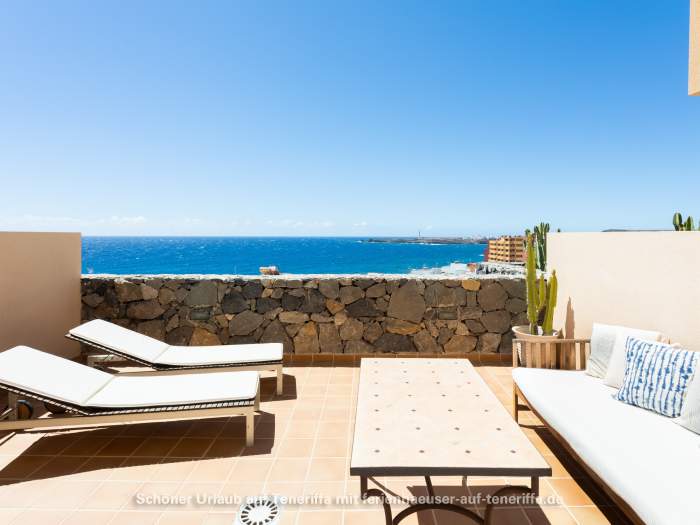 Von der Terrasse mit Gartenmöbeln genießen Sie einen wunderbaren Blick auf den Atlantik. Ein Gemeinschaftspool mit Sonnenterrasse lädt zum Entspannen ein.