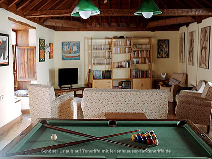 Der Wohnbereich ist mit gemütlichen Sitzmöbeln ausgestattet, die zum Relaxen einladen. Für Unterhaltung sorgt ein Billardtisch, und im WLAN können Sie bequem im Internet surfen.