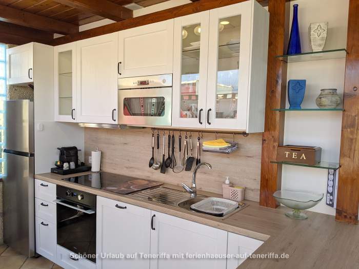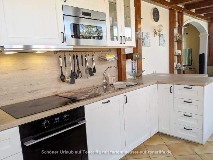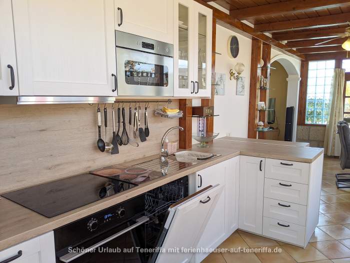 Der offene Koch- und Essbereich ist durch einen eleganten Rundbogen mit dem Wohnzimmer verbunden und bietet Platz für bis zu sechs Personen. Die voll ausgestattete Küche umfasst ein 4-Platten-Ceranfeld, Geschirrspüler, Backofen, Kühl-Gefrierkombination, Toaster, Eierkocher, Wasserkocher, Saftpresse und weiteres Zubehör, sodass Sie bequem Ihre Mahlzeiten zubereiten können.