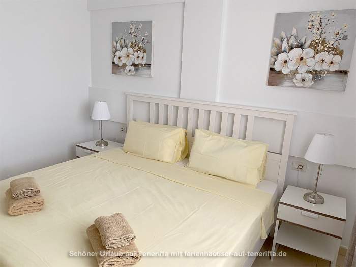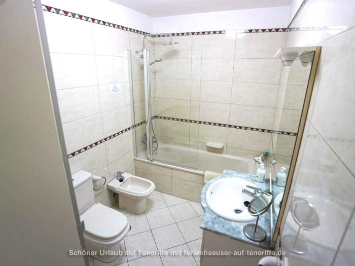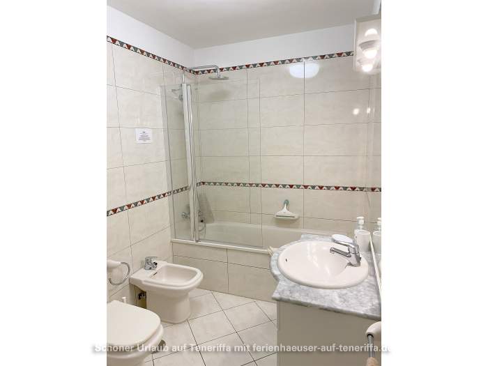 Im Schlafzimmer finden Sie ein 180 x 200 cm großes Doppelbett, einen Kleiderschrank, eine Kommode sowie zwei Nachttische. Ein Ventilator sorgt an warmen Nächten für angenehme Abkühlung. Das Badezimmer ist mit einer Badewanne inklusive stabiler Duschtrennwand, einer Regendusche, WC, Bidet, Waschbecken mit Unterschrank, Spiegel und Kosmetikspiegel ausgestattet.