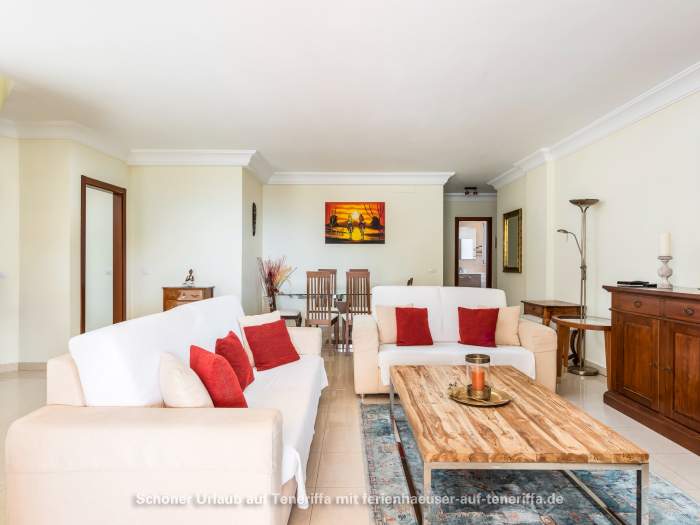 Mit 130 m² Wohnfläche bietet die Wohnung vier Schlafzimmer, drei Badezimmer, eine moderne Küche und einen komfortablen Wohnbereich. Dieser ist mit gemütlichen Sitzmöbeln, einem Esstisch und einem Fernseher ausgestattet. Deutsches Fernsehen ist empfangbar, und kostenloses WLAN sorgt für Internetzugang.