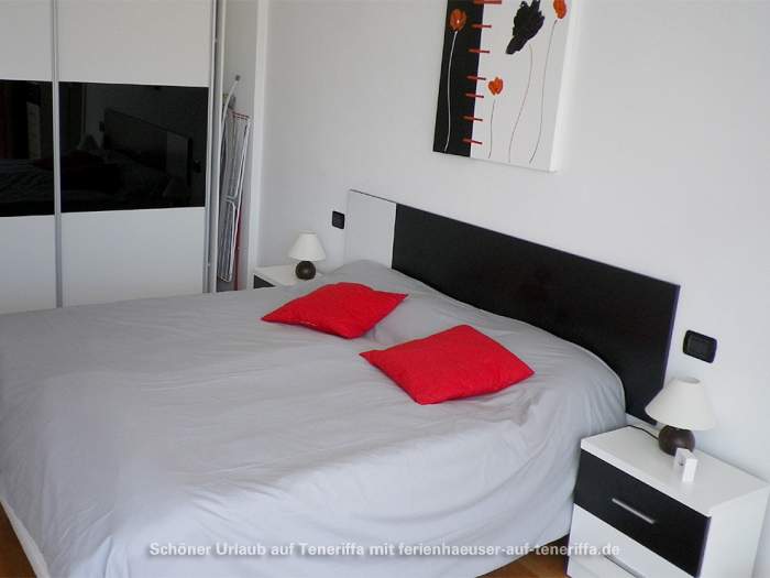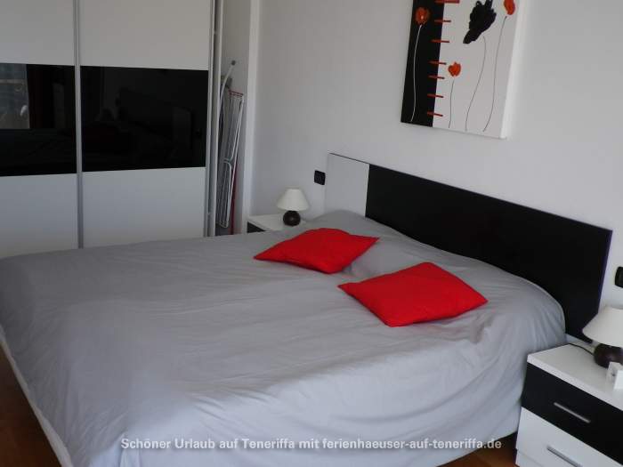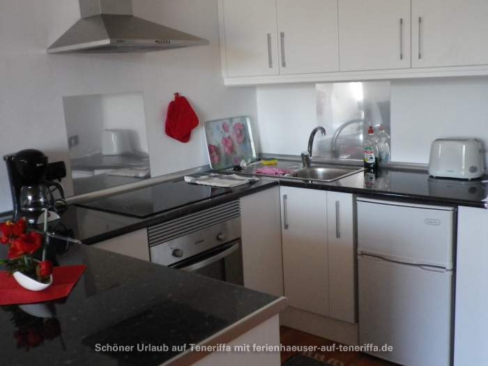 Die gut ausgestattete Küche verfügt über eine große Kühl- und Gefrierkombination, einen 4-Platten-Ceranherd, Backofen, Mikrowelle, Toaster, Kaffeemaschine, Mixer, Saftpresse und Wasserkocher – alles, was Sie für die Zubereitung Ihrer Mahlzeiten benötigen. Das Schlafzimmer ist mit einem komfortablen Doppelbett (180 x 200 cm, bestehend aus zwei Matratzen) sowie einem Kleiderschrank ausgestattet. Vom Schlafzimmer aus gelangen Sie direkt auf die Terrasse.