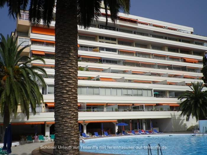 In dem gepflegten Apartmenthaus La Chiripa im Zentrum von Puerto de la Cruz befindet sich diese attraktive Ferienwohnung im dritten Stock, direkt zwischen zwei malerischen Parks. Der Zugang erfolgt bequem mit dem Aufzug, der Sie von der Lobby direkt in die Unterkunft bringt. Das Haus ist eingebettet in eine grüne, ruhige Umgebung, trotz der zentralen Lage. Der Außenbereich wird durch einen großen, im Winter beheizten Pool mit einem Durchmesser von etwa 18 Metern und einer Tiefe von 1,70 Metern geprägt. Ergänzt wird das Angebot durch eine großzügige Sonnenterrasse mit Liegen, Sonnenschirmen und Außenduschen, perfekt für entspannte Tage im Freien.