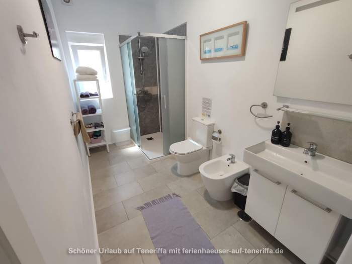 Das Badezimmer ist modern gestaltet und verfügt über eine Dusche, ein Waschbecken, WC sowie ein Bidet. Auch die Waschmaschine befindet sich hier.