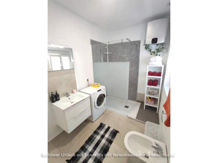 Auch das Badezimmer ist modern gestaltet und umfasst Dusche, Waschbecken, WC und ein Bidet. Die Waschmaschine befindet sich ebenfalls hier.