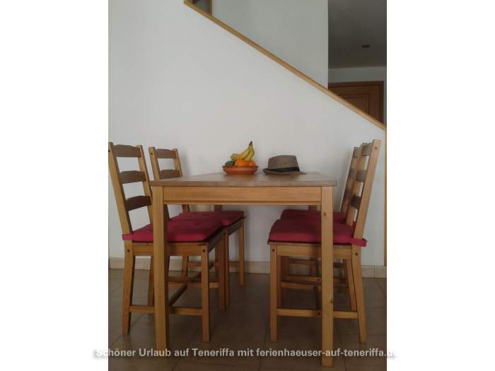 Der integrierte Esstisch mit vier Stühlen lädt zu gemeinsamen Mahlzeiten ein. Für den morgendlichen Kaffee gibt es zudem einen Tresen direkt an der Küche, der zusätzlichen Komfort bietet.