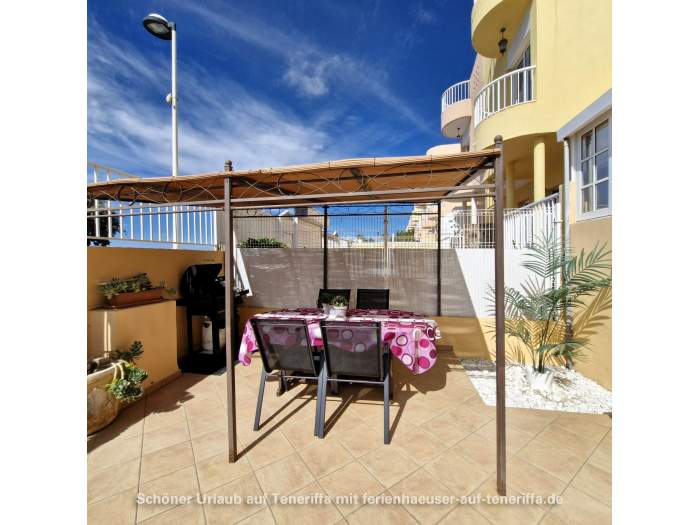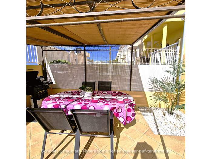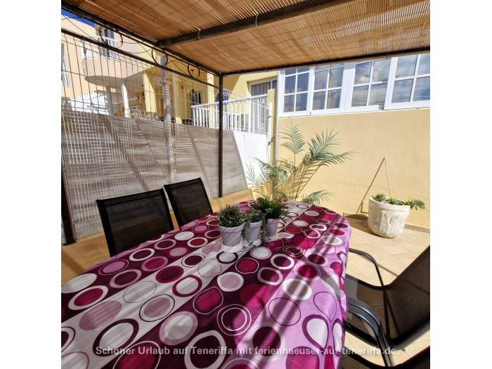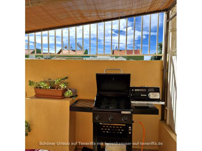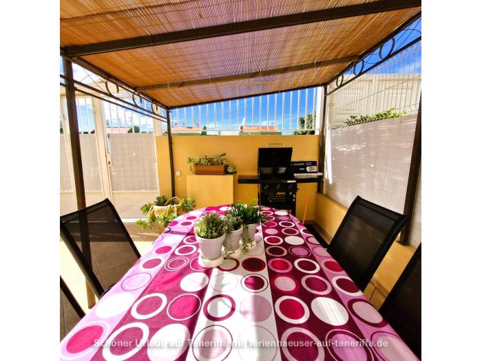 Im Außenbereich des Hauses gibt es eine Terrasse mit Sonnenschutz und einem Grill. Er steht auch ein Esstisch, so dass man sich hier prima zusammensetzen kann und Kinder hier ungefährdet spielen können. Zusätzlich dazu gibt es auch dem Dach noch eine Terrasse mit Sonnenschirm und zwei Liegen, die einen wundervollen Blick bis nach La Gomera bietet.