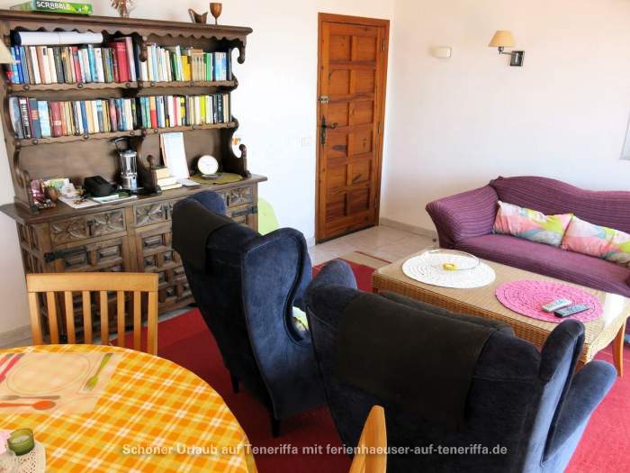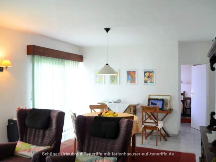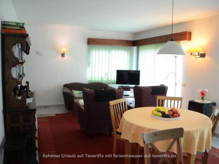 Für das Essen steht im Wohnbereich ein Esstisch, an dem 4 Personen Platz finden. Neben diesem gibt es dort auch eine gemütliche TV-Ecke.