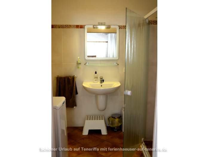 Das Badezimmer ist mit einer Duschkabine, dem WC und einem Waschbecken ausgestattet.