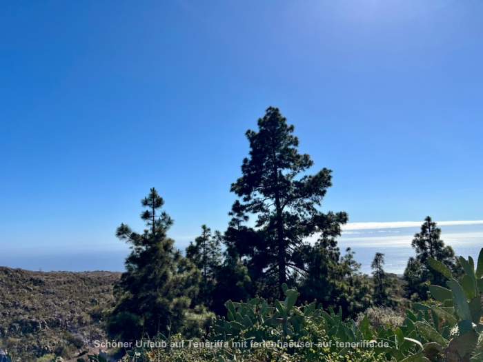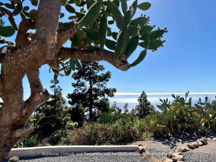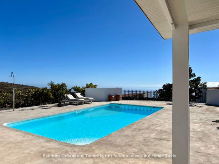 Vom Pool aus eröffnet sich ein weiter Blick über vereinzelte höher gelegene Häuser, die umliegenden Berge und den entlang der Grundstücksgrenze verlaufenden Barranco bis hinunter zur Westküste und zum Atlantik. Bei klarer Sicht erscheinen sogar La Gomera, La Palma und El Hierro am Horizont.