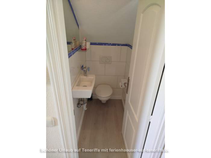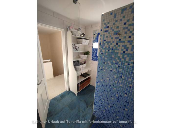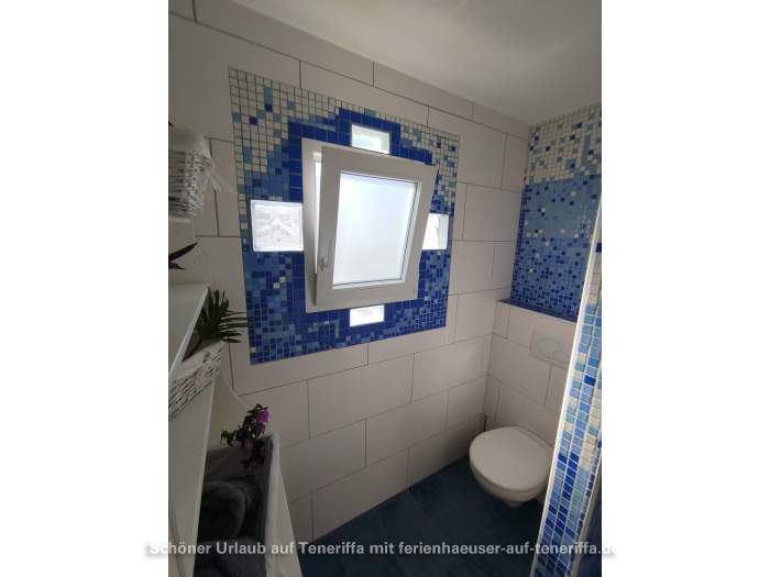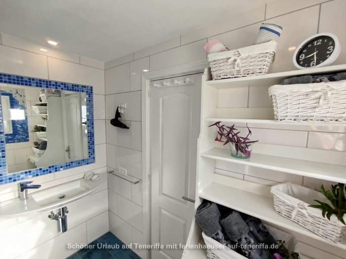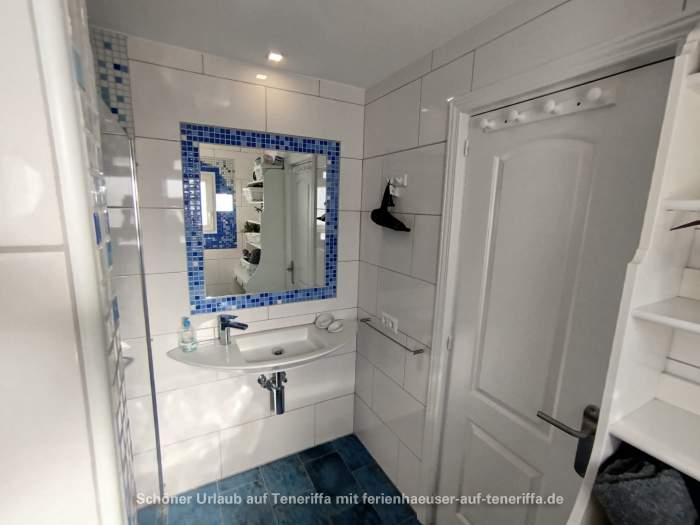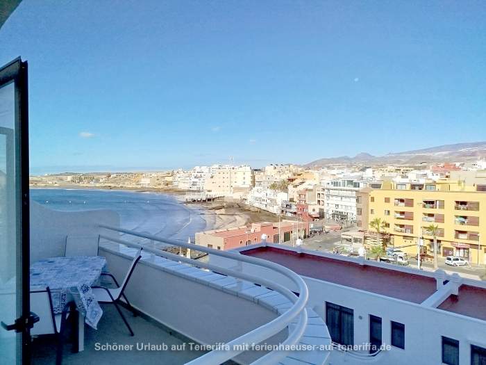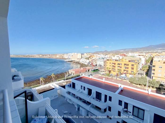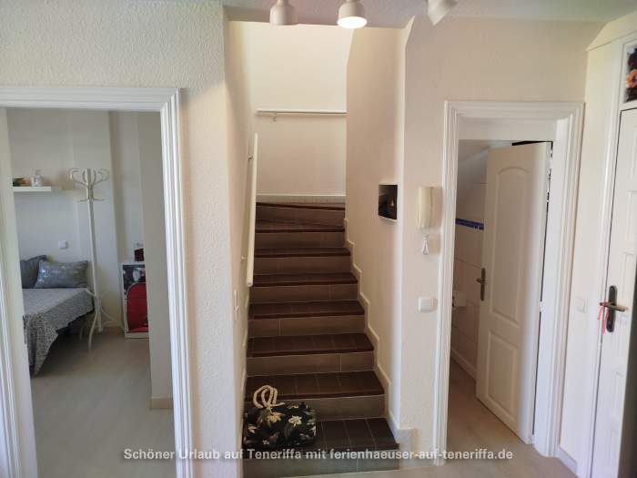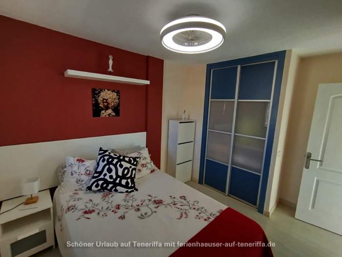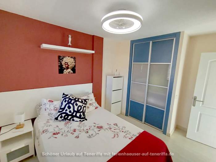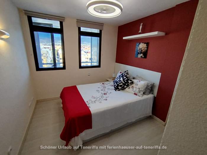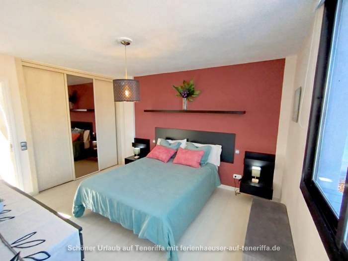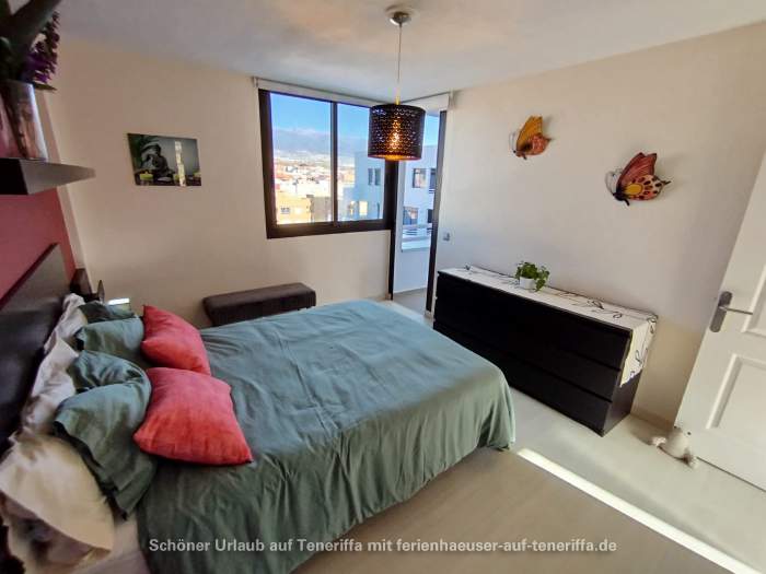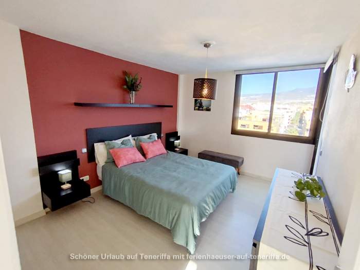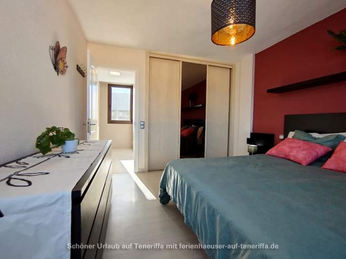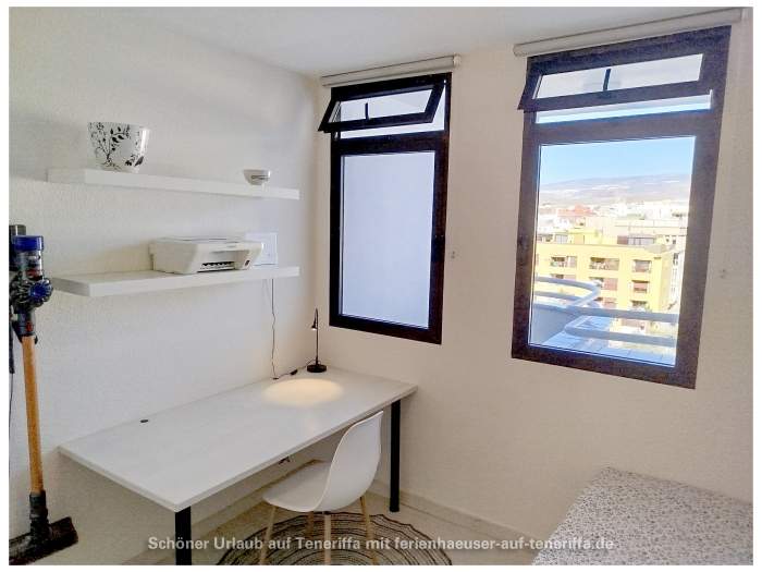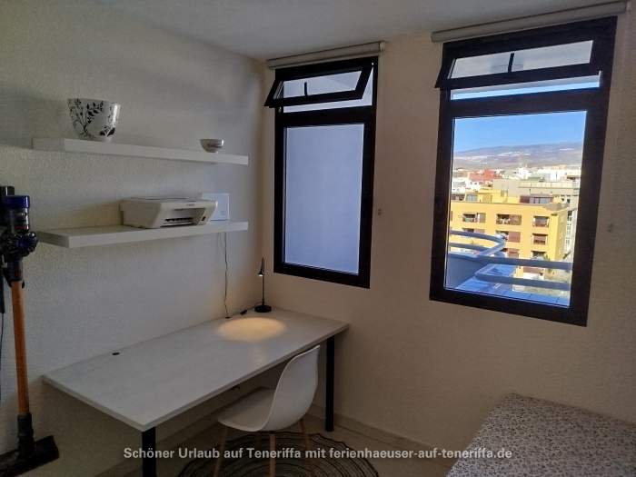 Die Duplexwohnung erstreckt sich über die fünfte und sechste Etage und begeistert mit einem fantastischen Blick auf die Bucht von El Médano und den Atlantik. Die geschützte Terrasse bietet einen angenehmen Platz für Mahlzeiten im Freien. Im oberen Bereich liegen zwei Schlafzimmer mit Doppelbetten und ein modernes Duschbad. Im unteren Bereich befinden sich ein Gäste-WC und ein kleines Schlafzimmer mit Einzelbett und Schreibtisch.