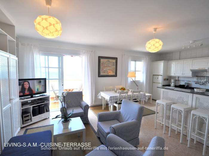 Die Penthousewohnung besticht durch eine stilvolle, detailreiche Einrichtung im maritimen Stil. Der offene Flur führt direkt ins helle und komfortable Wohnzimmer, das mit einem Flatscreen-TV, Sat-TV, DVD-Player, Brettspielen, Filmen und Büchern ausgestattet ist. Die Terrasse, die direkt an den Wohnbereich anschließt, bietet einen atemberaubenden Blick auf das Meer, den Strand und die Promenade. Sonnenliegen und eine elektrische Markise sorgen für angenehmen Schatten und optimale Entspannung im Freien.