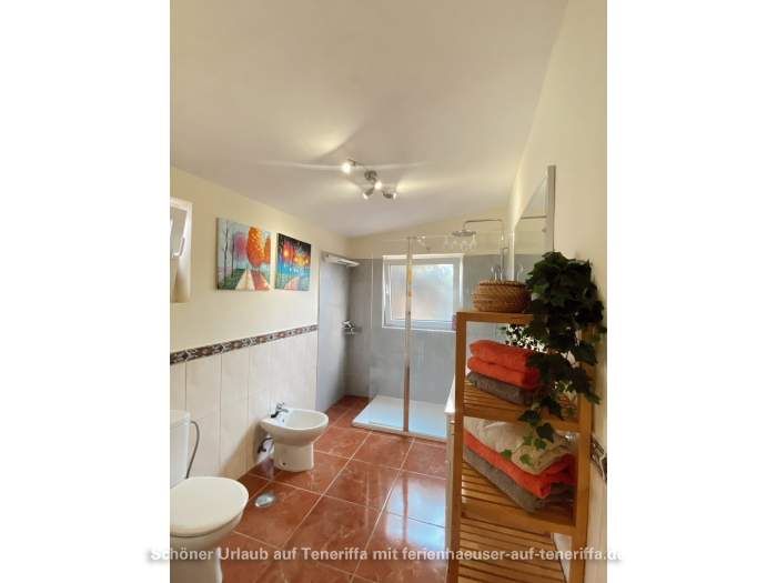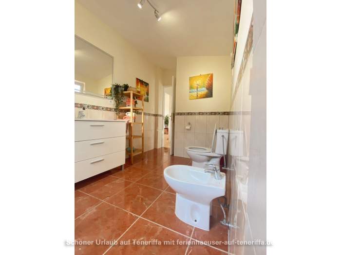 Die beiden Badezimmer überzeugen durch stilvolles Design und Komfort. Eines ist mit Dusche und WC ausgestattet, das andere mit Badewanne, Bidet und WC – perfekt für entspannte Momente nach einem Tag am Strand oder in der Natur.