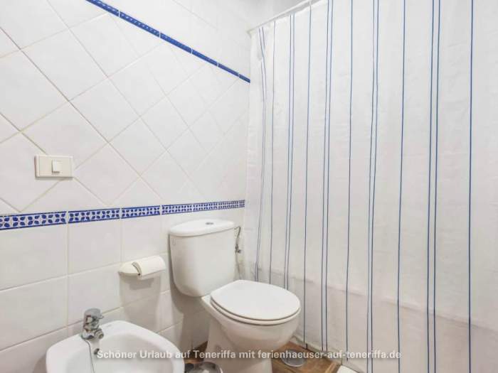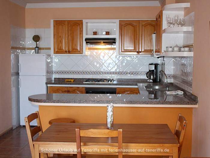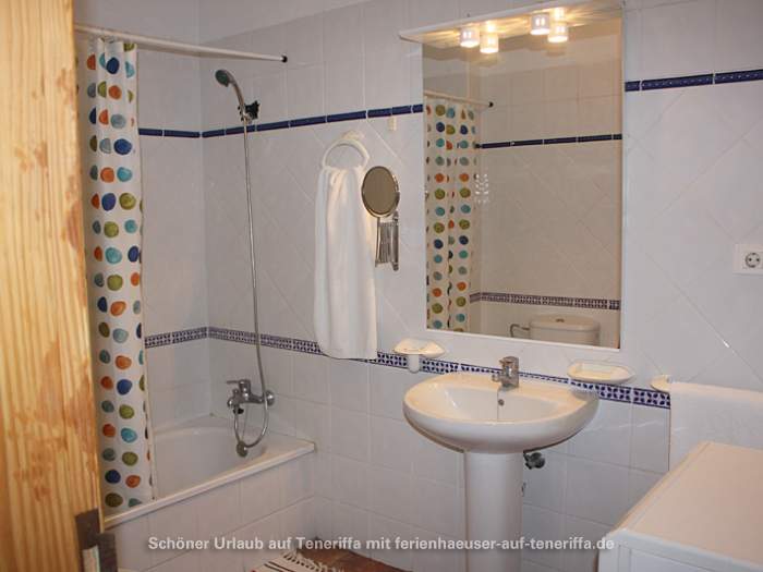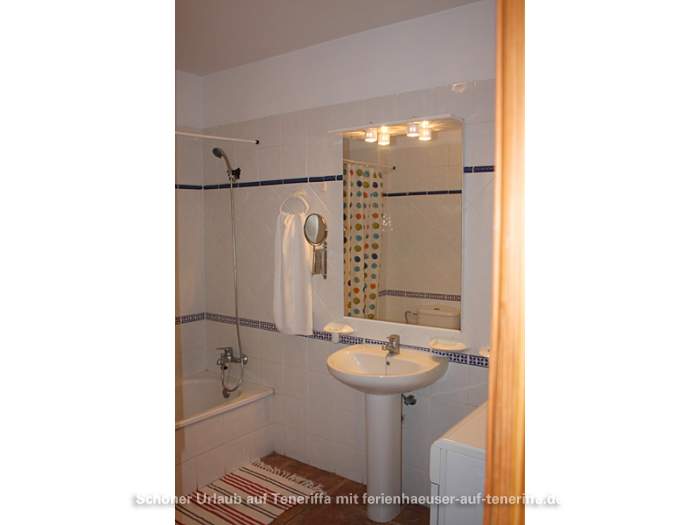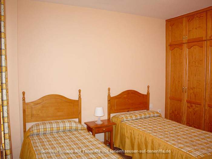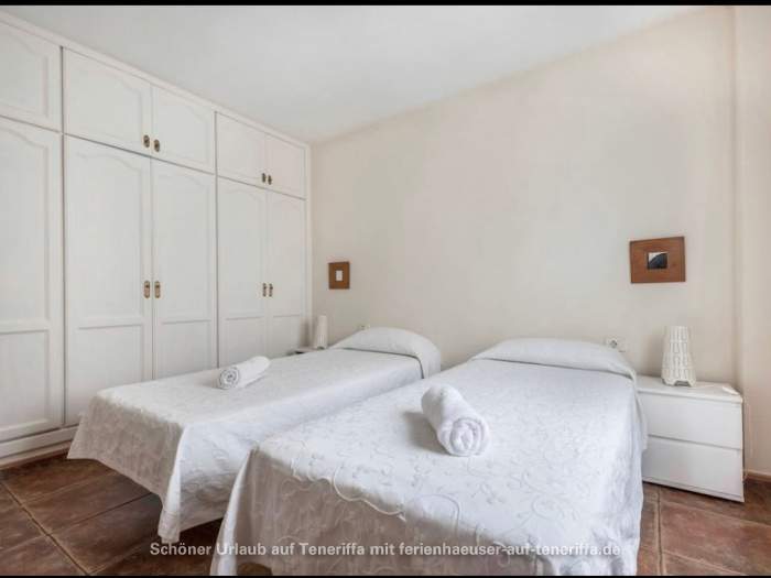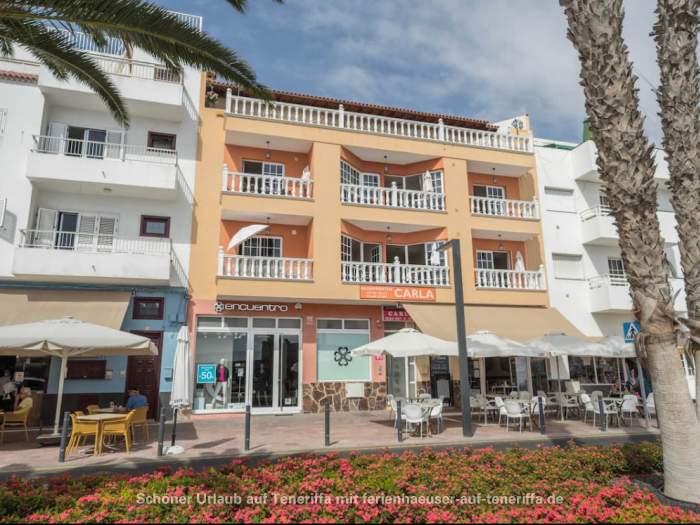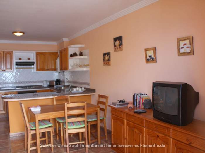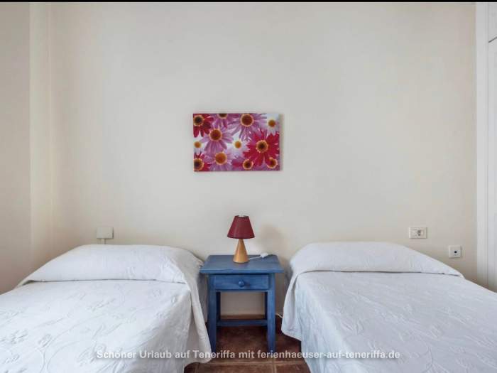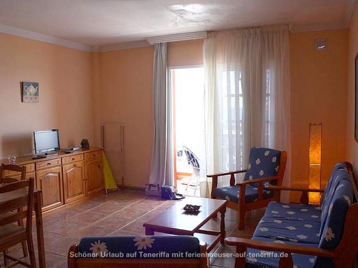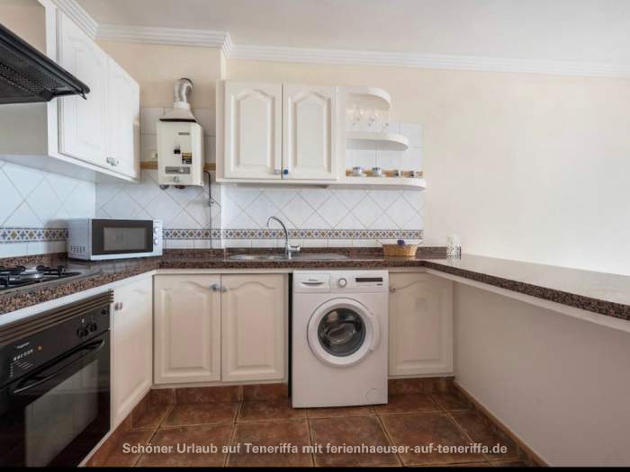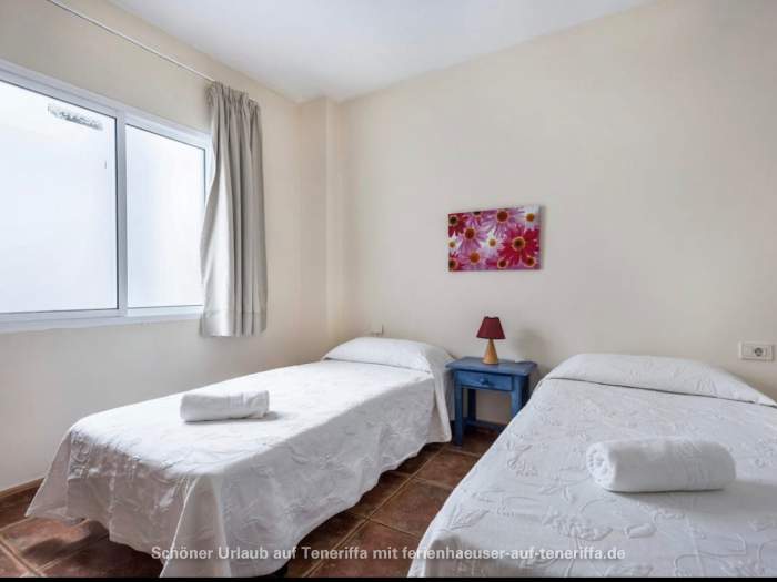 Das kanarische Haus mit insgesamt acht Ferienwohnungen befindet sich aufgeteilt auf die erste und zweite Etage. Die angebotene Wohnung mit zwei Schlafzimmern ist für 3 bis 4 Personen geeignet. Sie besteht aus einem Wohnraum mit integrierter Küche, zwei Schlafzimmern, einem Badezimmer und einem Balkon. Die Küche ist voll ausgestattet mit einem 4-Platten-Herd, Backofen, Kühlschrank mit Gefrierfach und weiteren Küchenutensilien. Das Badezimmer verfügt über eine Badewanne, Waschbecken, WC und Waschmaschine. Der Balkon bietet einen kleinen Tisch mit zwei Stühlen und einen Blick in Richtung Meer.
