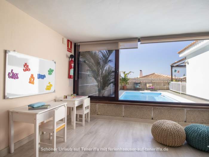 Arbeitsbereich: Separater, lichtdurchfluteter Raum mit Glasfaser-Internet, ideal für digitale Nomaden, die Arbeit und Urlaub verbinden möchten, während sie den Poolbereich im Blick behalten.