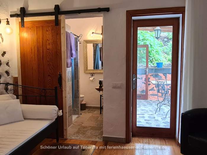 Das kleine Häuschen präsentiert sich auch im Inneren mit typisch kanarischen Charme und wohligem Ambiente. Es gibt einen Wohn- / Schlafbereich mit Schlaf-Sofa, Couchtisch, SAT-TV, Essplatz und Doppelbett, ein kleines Duschbad, das auch von der Terrasse aus begehbar ist und eine kleine, gut ausgestattete Küche, die ausschließlich von der Terrasse aus begehbar ist.