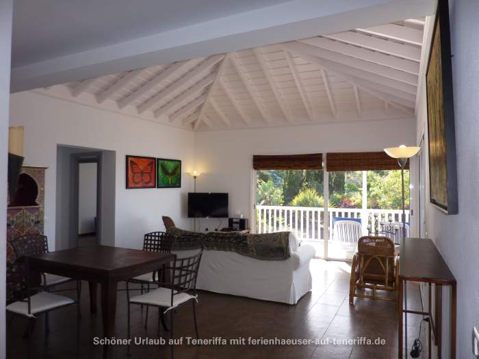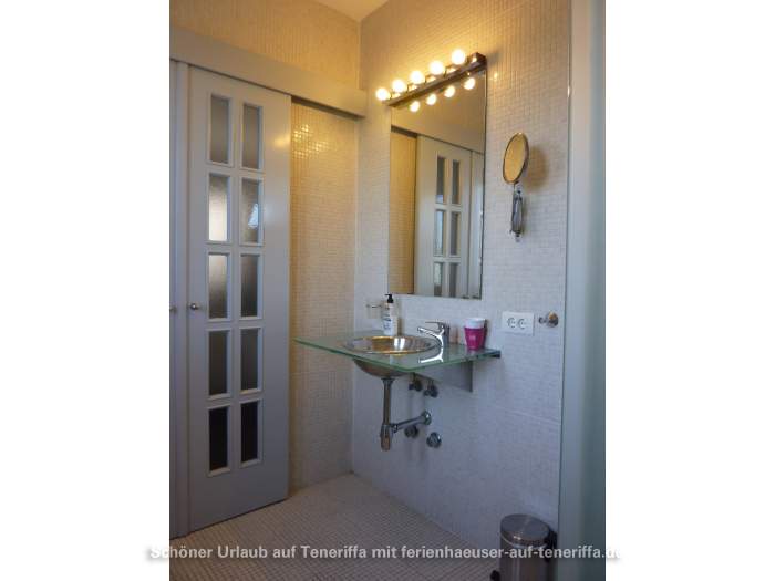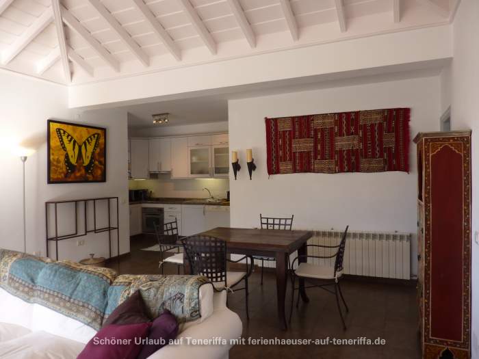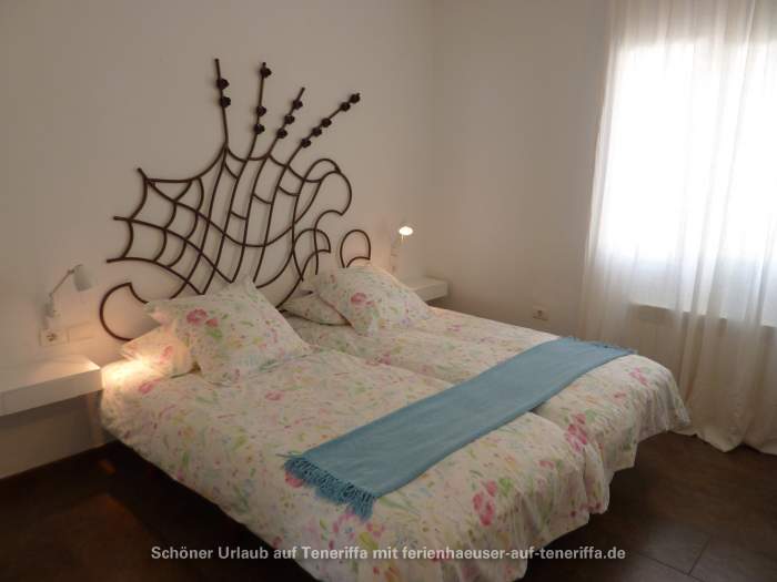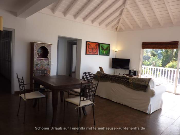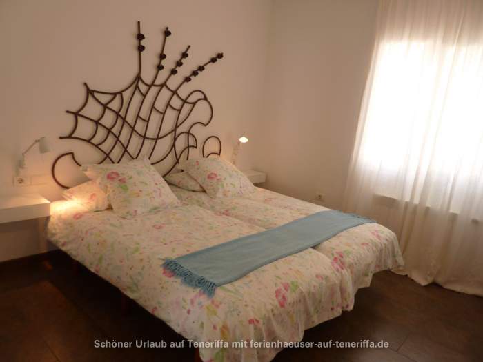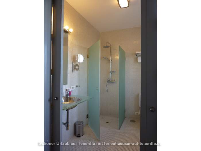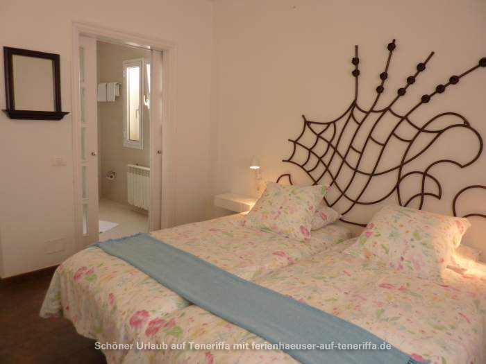 Der Eingangsbereich der lichtdurchfluteten Villa führt in einen großzügigen Flur, von dem aus Sie in den offenen Wohnraum gelangen. Das Ambiente ist einzigartig, geprägt durch die großen Panoramafenster, die einen herrlichen Blick auf den Teide und den Atlantik bieten. Die voll ausgestattete offene Küche verfügt über Backofen, Nespresso-, Filter- und Senseo-Kaffeemaschinen, Geschirrspüler, Kochherd sowie Waschmaschine und Trockner. Das Haus bietet zwei Schlafzimmer mit je zwei Einzelbetten (100x190 cm), eines davon mit eigenem Badezimmer en suite und Duschkabine. Das dritte Schlafzimmer ist mit einem Etagenbett ausgestattet, geeignet für eine erwachsene Person oder zwei Kinder bis 12 Jahre.